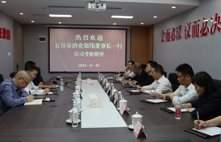 4月15日,五谷春酒业党委书记、董事长郑伟,党委委员、总工程师曾田,销售中心主任李刚一行莅临太阳成集团tyc234cc酒业考察指导并召开座谈会。太阳成集团tyc234cc酒业党总支部书记、董事长陈林才,总经理张太平,党总支部委员、总工程师李彦中热情接待,五粮液驻太阳成集团tyc234cc酒业技术咨询组组长梁露及咨询组专家参加座谈会。