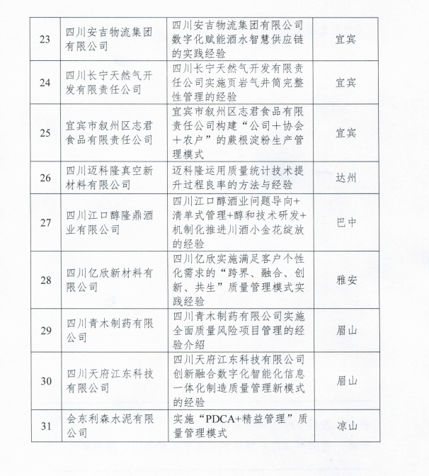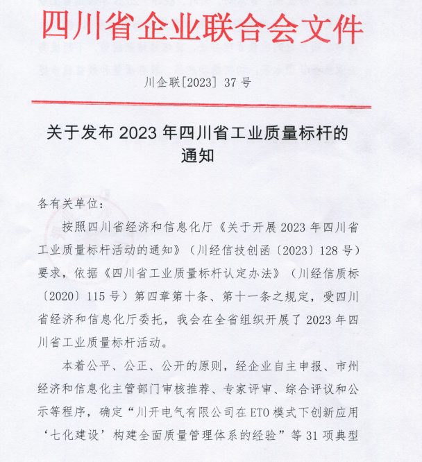 此次活动,本着公平、公正、公开的原则,经企业自主申报、市州经济和信息化主管部门审核推荐、专家评审、综合评议和公示等程序,确定“川开电气有限公司在ETO模式下创新应用‘七化建设’构建全面质量管理体系的经验”等31项典型经验为2023年四川省工业质量标杆。