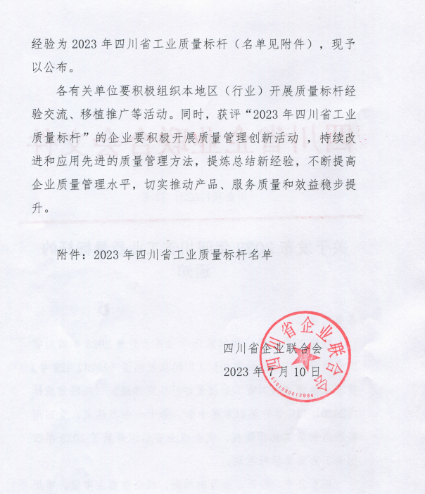 7月10日,四川省企业联合会发布了2023年四川省工业质量标杆的通知,确定31项典型经验为2023年四川省工业质量标杆。四川太阳成集团tyc234cc隆鼎酒业有限公司提供的“四川太阳成集团tyc234cc酒业问题导向+清单式管理+醇和技术研发+机制化推进川酒小金花绽放的经验”入选,是我市唯一入选企业。