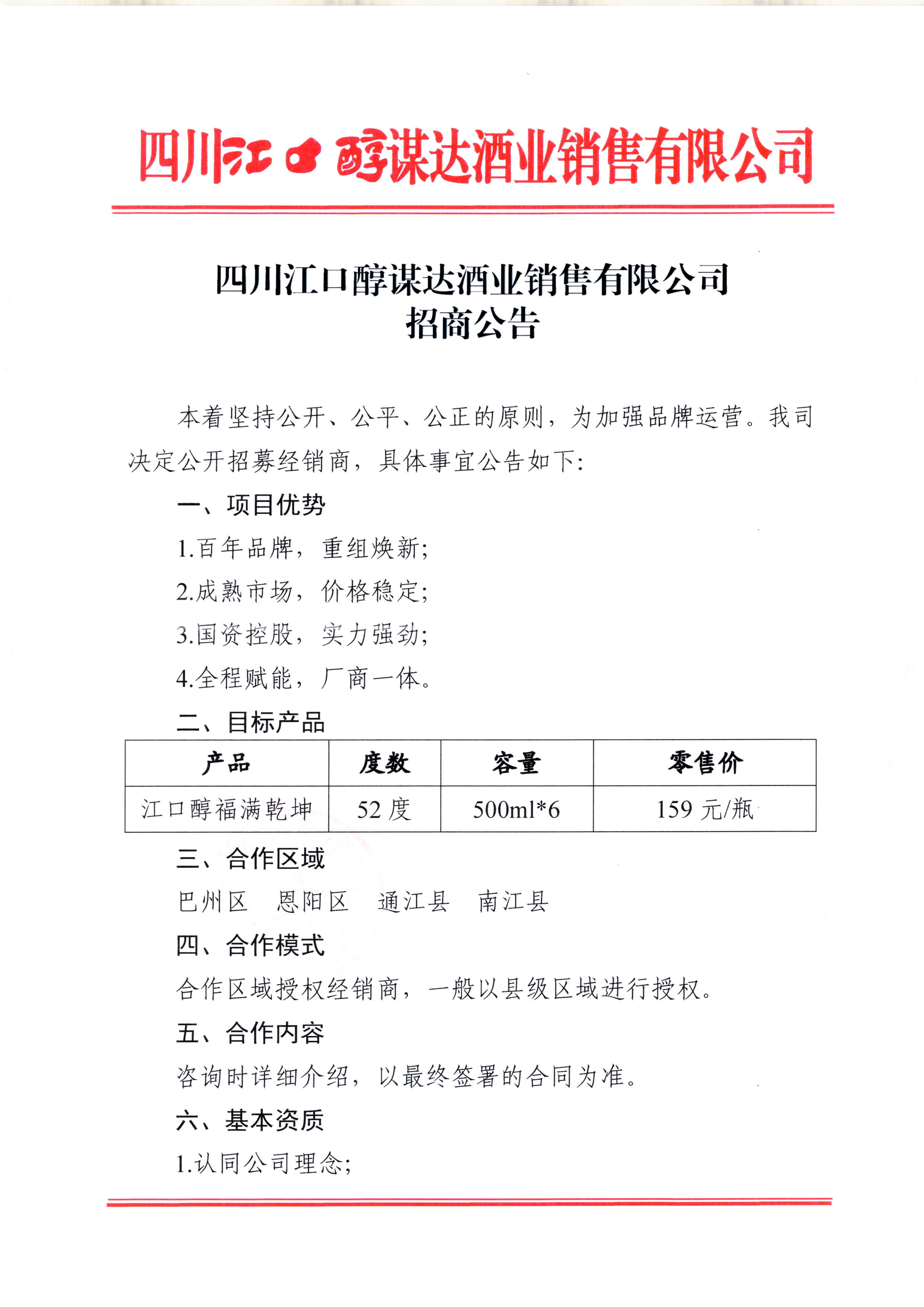 太阳成集团tyc234cc福满乾坤酒,招商公告