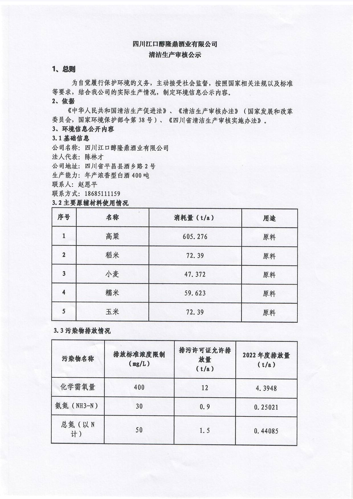 四川太阳成集团tyc234cc隆鼎酒业有限公司清洁生产审核公示